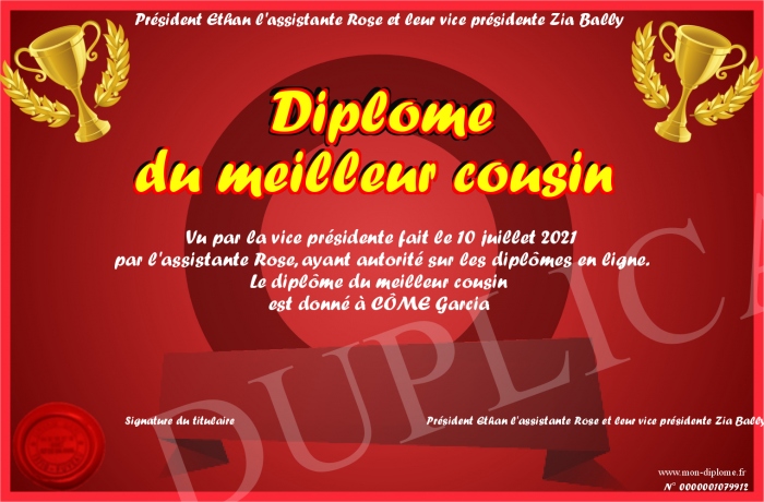 Envoyez par email votre Diplôme du meilleur cousin personalisé
