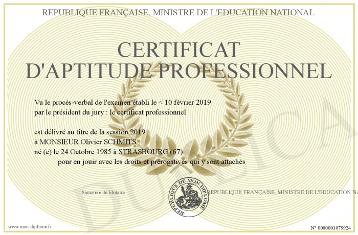 Envoyez par email votre CERTIFICAT D'APTITUDE PROFESSIONNEL personalisé