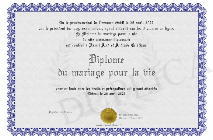 Envoyez par email votre Diplôme du mariage pour la vie personalisé
