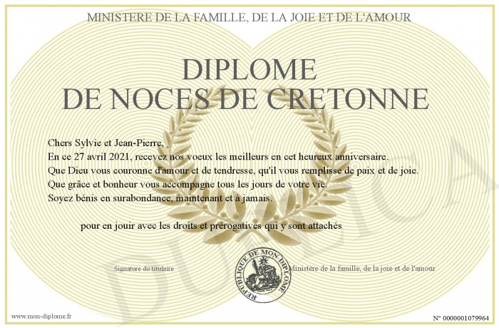 Envoyez par email votre Diplôme de Noces de Cretonne personalisé