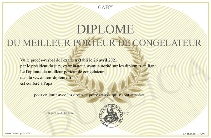Envoyez par email votre Diplôme du meilleur porteur de congélateur personalisé