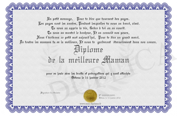 Envoyez par email votre Diplome de la meilleure Maman personalisé