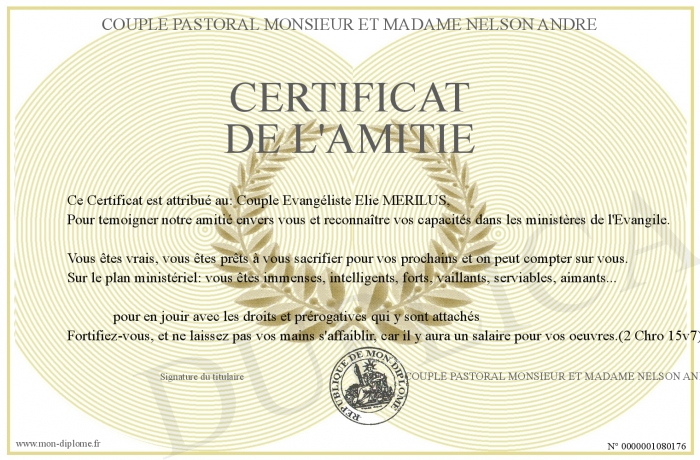 Envoyez par email votre CERTIFICAT DE L'AMITIE personalisé