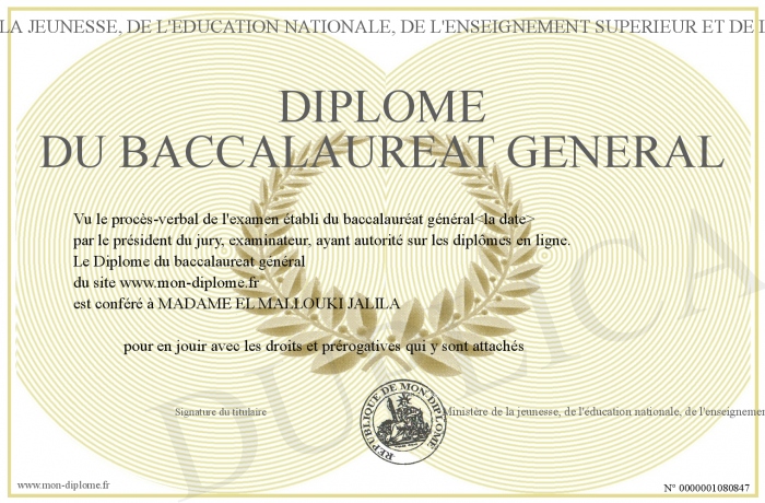 Envoyez par email votre Diplôme du baccalaureat général personalisé