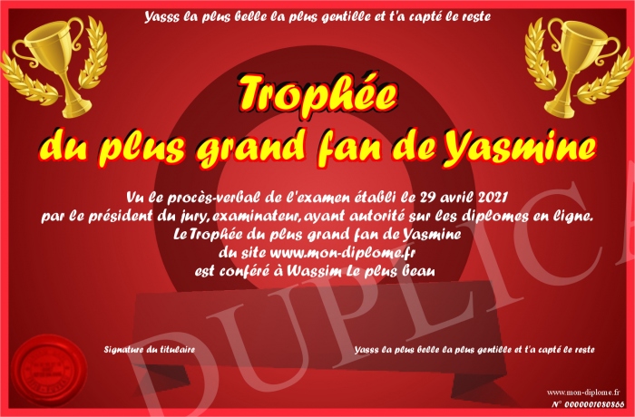 Envoyez par email votre Trophée du plus grand fan de Yasmine personalisé