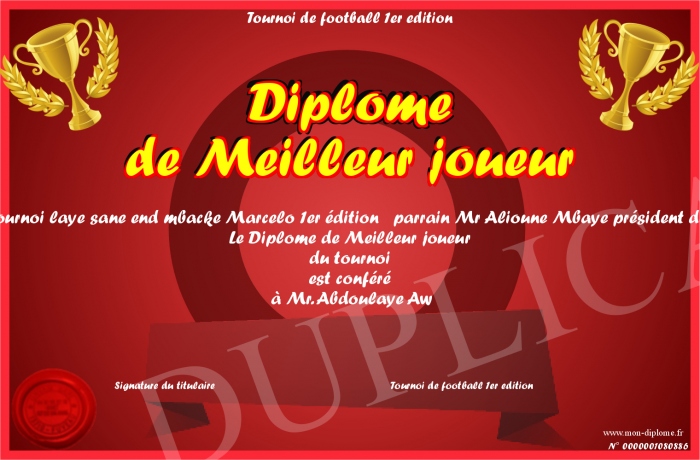 Envoyez par email votre Diplome de Meilleur joueur personalisé