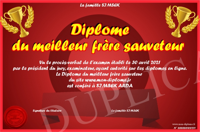 Envoyez par email votre Diplôme du meilleur frère sauveteur personalisé
