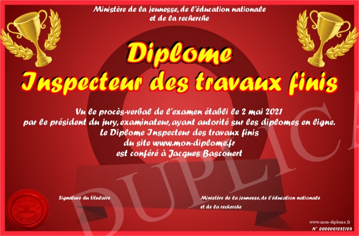 Envoyez par email votre Diplôme Inspecteur des travaux finis personalisé