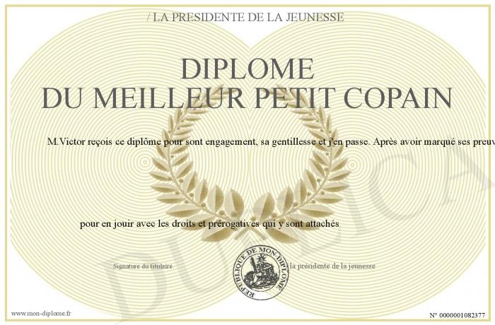 Envoyez par email votre Diplôme du meilleur petit copain personalisé