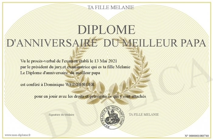 Envoyez par email votre Diplôme d'anniversaire du meilleur papa personalisé