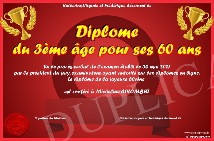 Envoyez par email votre Diplôme du 3ème âge pour ses 60 ans personalisé