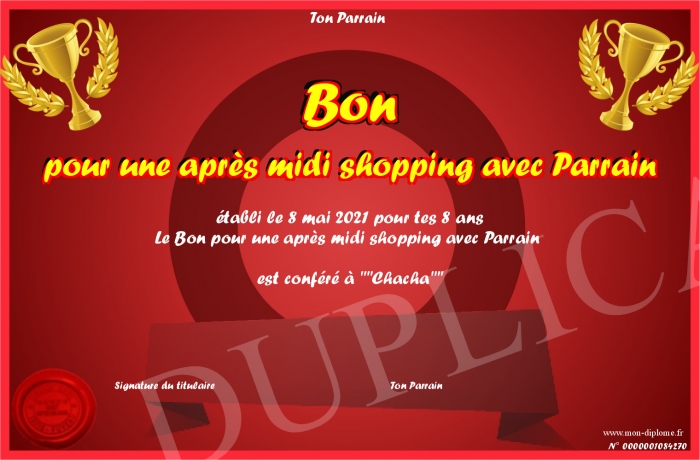 Envoyez par email votre Bon pour une après midi shopping avec Parrain personalisé