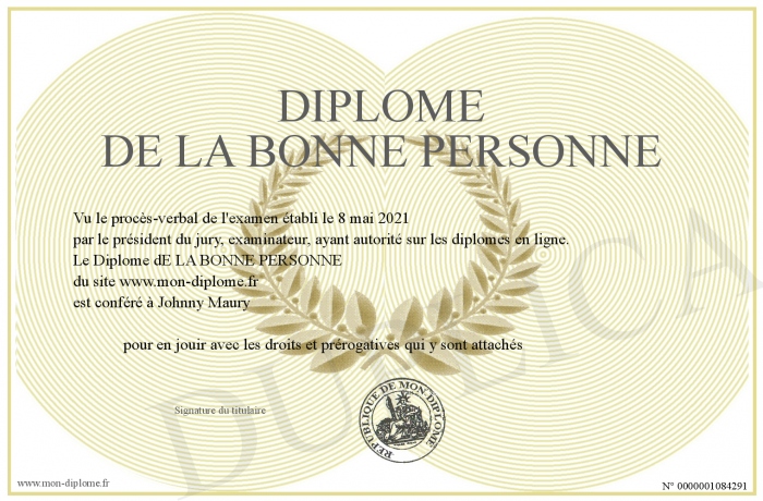 Envoyez par email votre Diplôme dE LA BONNE PERSONNE personalisé