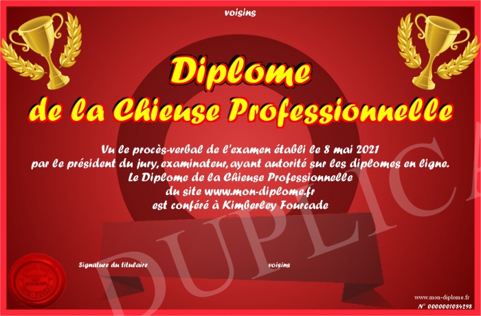 Envoyez par email votre Diplôme de la Chieuse Professionnelle personalisé
