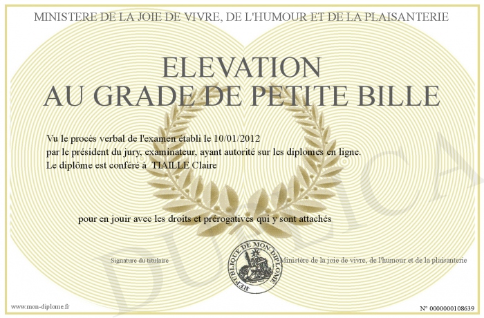 Envoyez par email votre ELEVATION AU GRADE DE PETITE BILLE personalisé