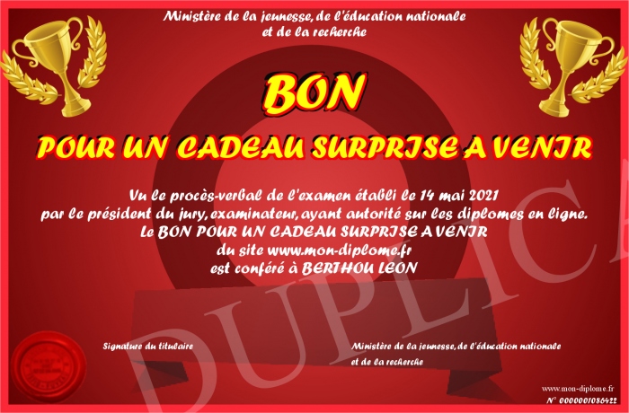 Envoyez par email votre BON POUR UN CADEAU SURPRISE A VENIR personalisé