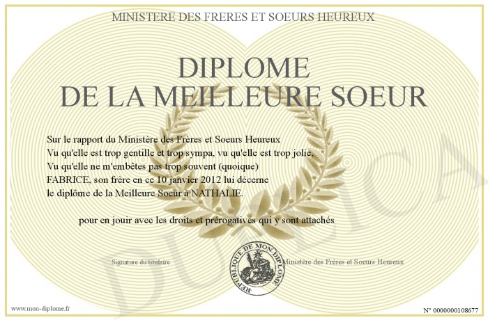 Envoyez par email votre Diplome de la meilleure Soeur personalisé