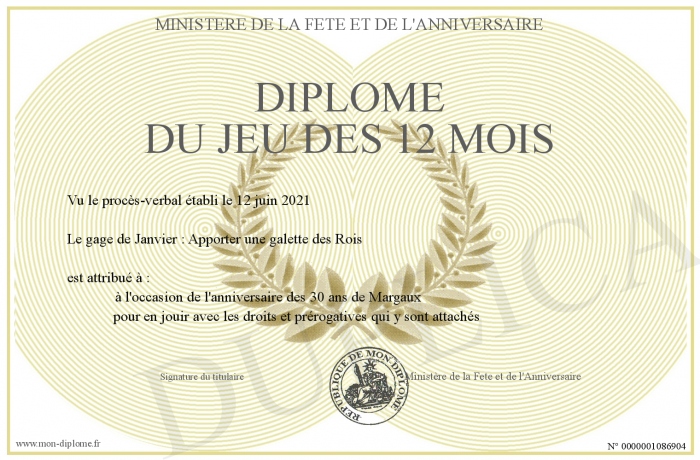 Envoyez par email votre Diplôme du Jeu des 12 mois personalisé