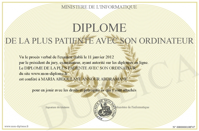 Envoyez par email votre DIPLOME DE LA PLUS PATIENTE AVEC SON ORDINATEUR personalisé