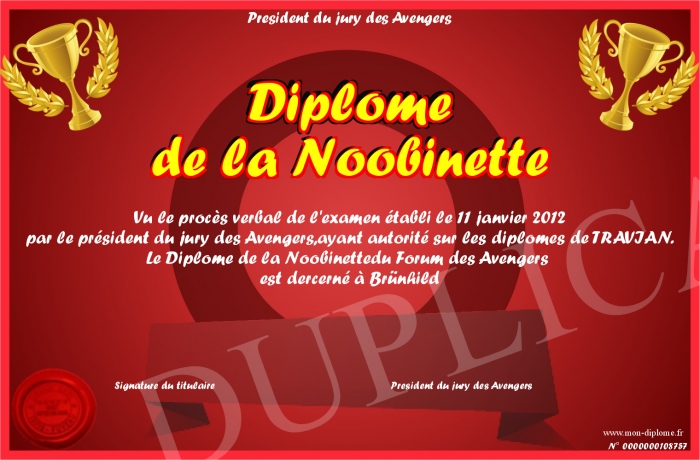 Envoyez par email votre Diplome de la Noobinette personalisé