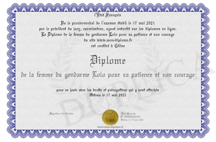 Envoyez par email votre Diplôme de la femme du gendarme Lolo pour sa patience et son courage personalisé
