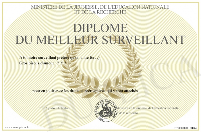 Envoyez par email votre Diplôme du meilleur surveillant personalisé