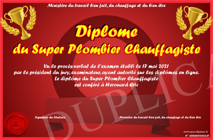 Envoyez par email votre Diplôme du Super Plombier Chauffagiste personalisé
