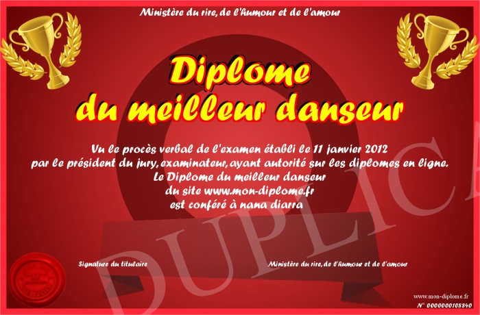 Envoyez par email votre Diplome du meilleur danseur personalisé
