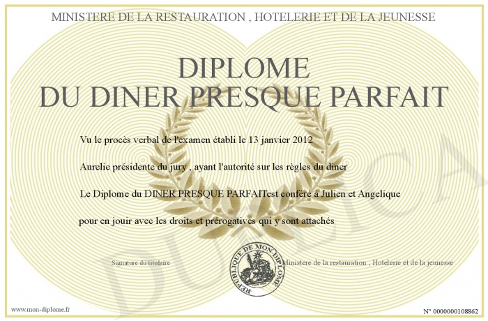 Envoyez par email votre Diplome du DINER PRESQUE PARFAIT personalisé