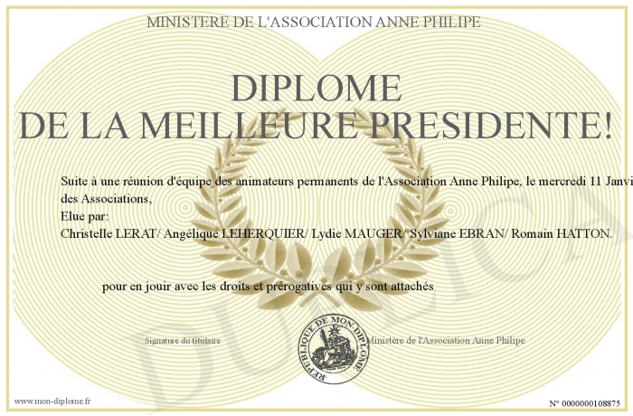 Envoyez par email votre Diplôme de la meilleure PRESIDENTE! personalisé
