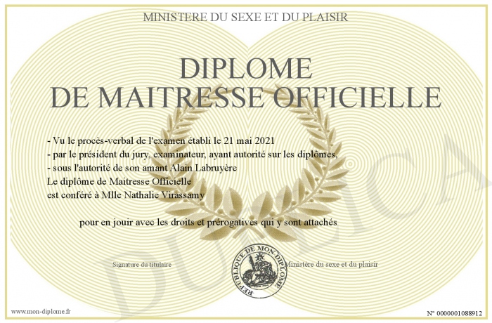 Envoyez par email votre Diplôme De Maitresse Officielle personalisé