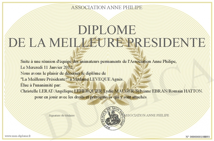 Envoyez par email votre Diplôme de la Meilleure Présidente personalisé