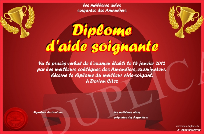 Envoyez par email votre Diplome d'aide soignante personalisé