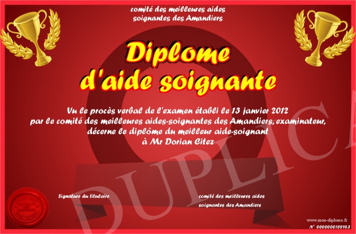 Envoyez par email votre Diplome d'aide soignante personalisé
