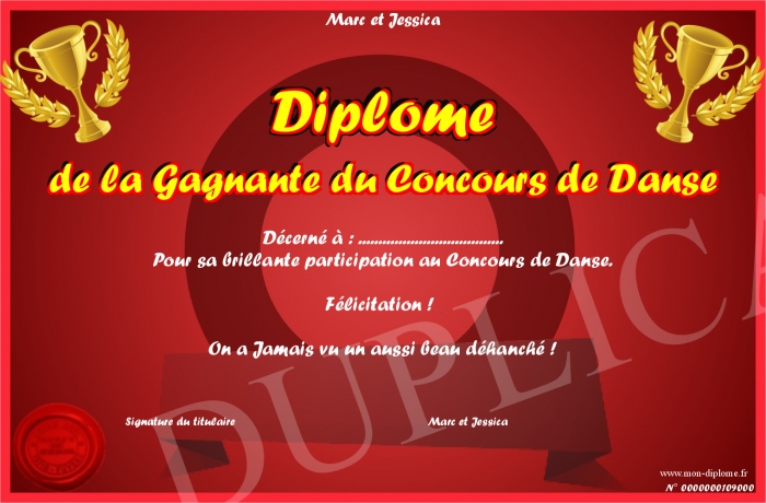 Envoyez par email votre Diplôme de la Gagnante du Concours de Danse personalisé