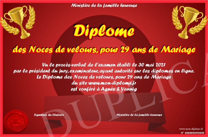 Envoyez par email votre Diplôme des Noces de velours, pour 29 ans de Mariage personalisé