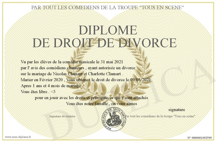 Envoyez par email votre Diplôme de droit de DIVORCE personalisé