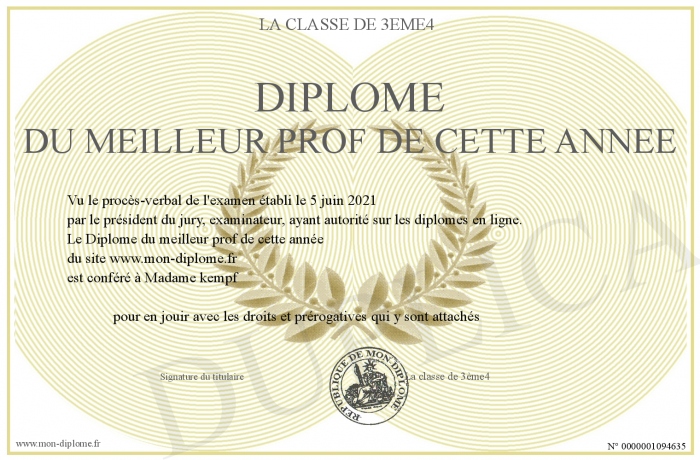 Envoyez par email votre Diplôme du meilleur prof de cette année personalisé