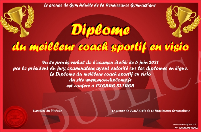 Envoyez par email votre Diplôme du meilleur coach sportif en visio personalisé