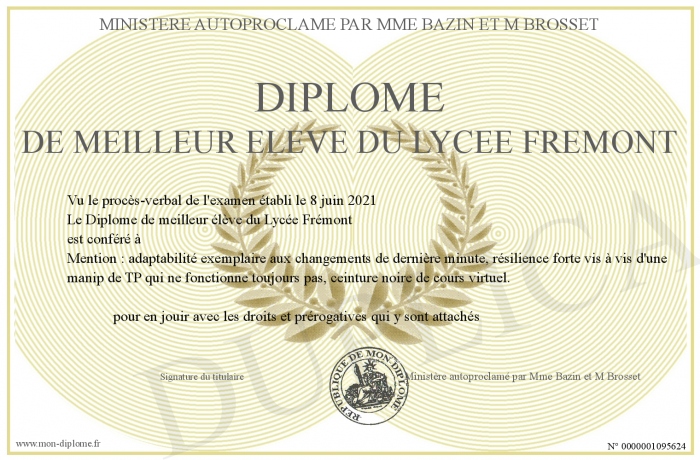 Envoyez par email votre Diplôme de meilleur élève du Lycée Frémont personalisé