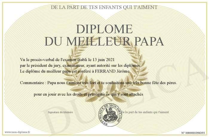 Envoyez par email votre Diplôme du meilleur papa personalisé
