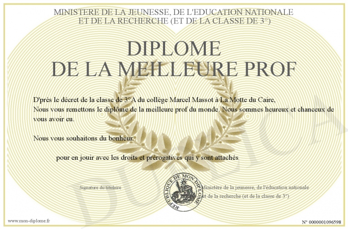 Envoyez par email votre Diplôme de la meilleure prof personalisé