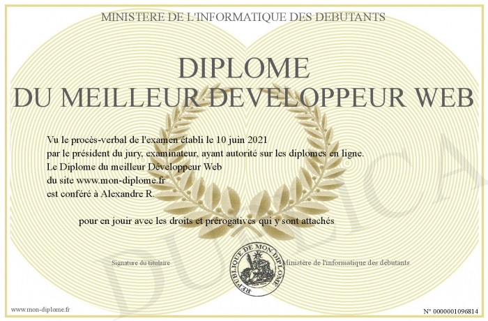Envoyez par email votre Diplôme du meilleur Développeur Web personalisé
