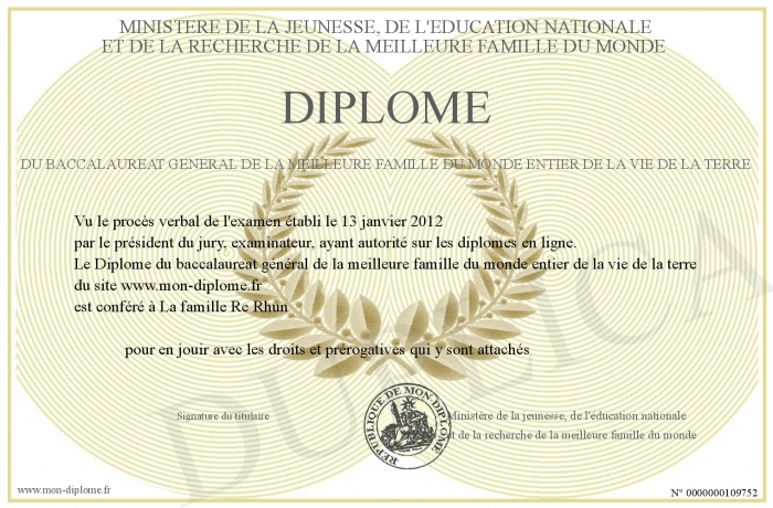 Envoyez par email votre Diplôme du baccalaureat général de la meilleure famille du monde entier de la vie de la terre personalisé