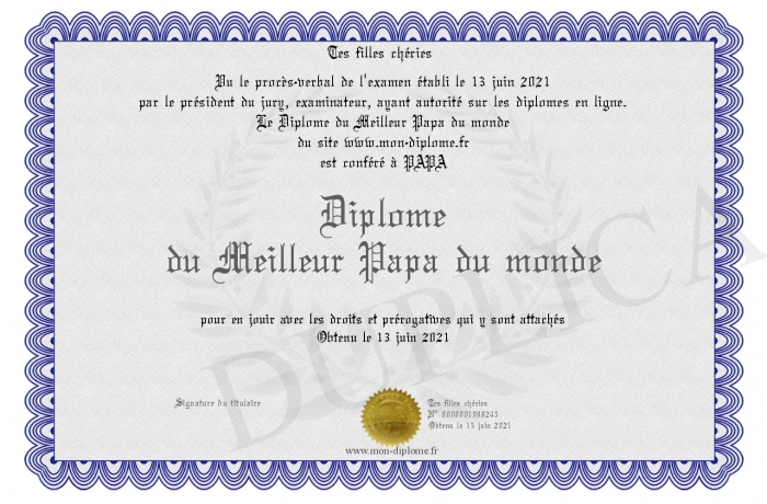 Envoyez par email votre Diplôme du Meilleur Papa du monde personalisé