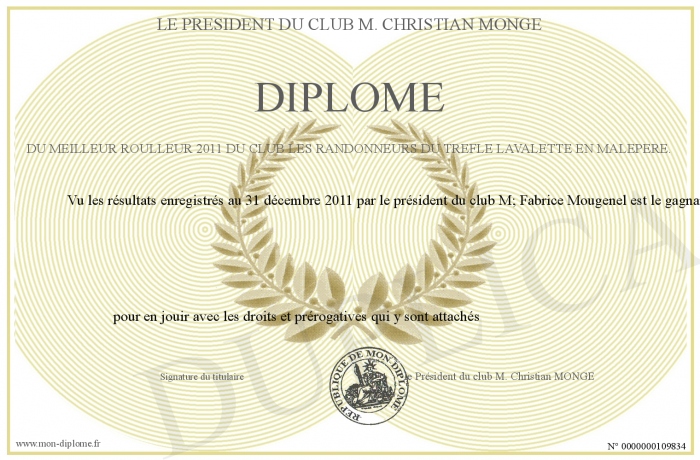 Envoyez par email votre Diplome du meilleur roulleur 2011 du club les randonneurs du trèfle Lavalette en Malepère. personalisé