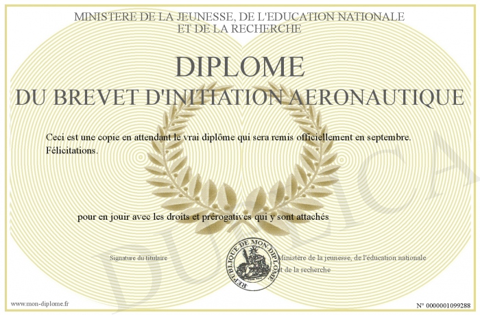 Envoyez par email votre Diplôme du brevet d'initiation aéronautique personalisé