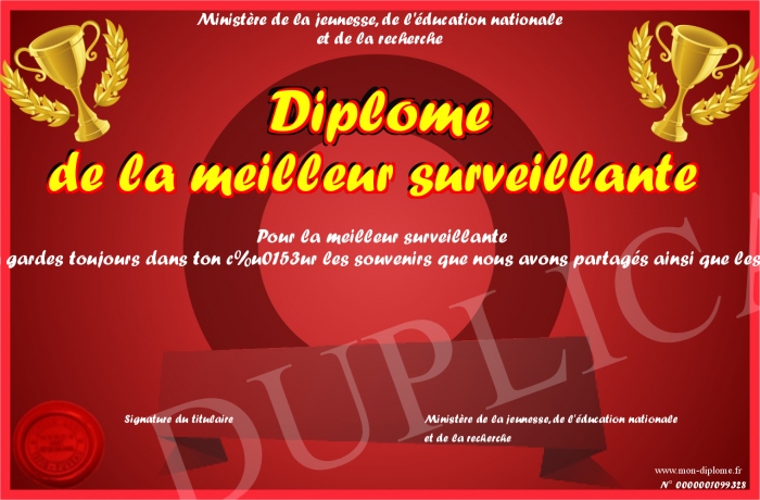 Envoyez par email votre Diplôme de la meilleur surveillante personalisé