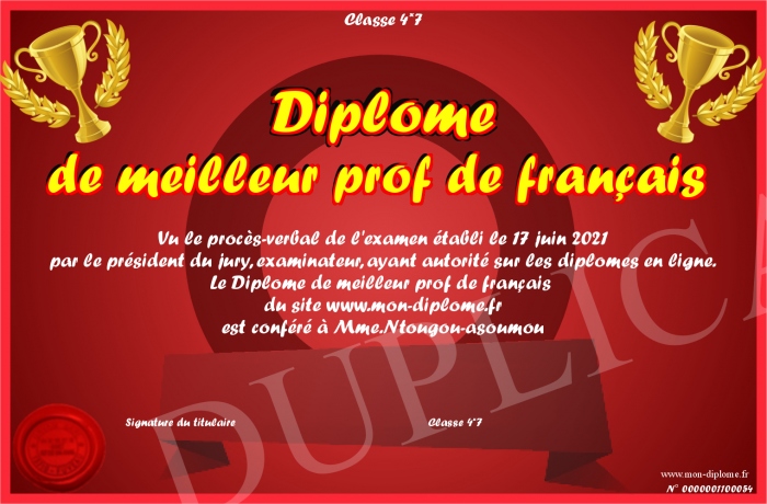 Envoyez par email votre Diplôme de meilleur prof de français personalisé