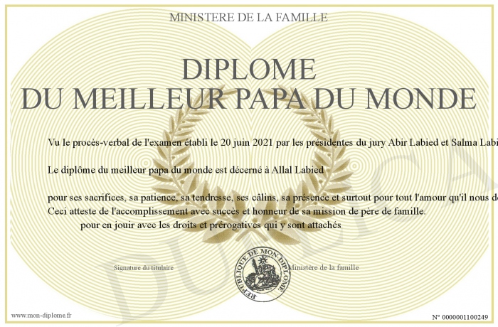 Envoyez par email votre Diplôme du meilleur papa du monde personalisé